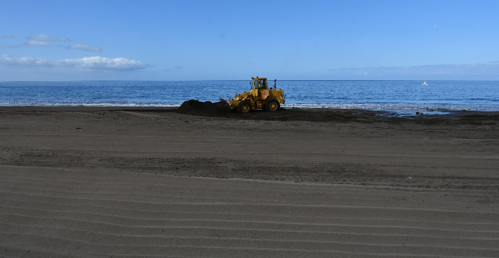 Los trabajos han comenzado desde primera hora en la playa de Taurito, donde un tractor ha realizado un intenso y continuo arado de la arena de hasta 30 centímetros de profundidad para lograr airearla y acabar con las bacterias que pueden proliferar en las zonas donde el agua del mar no llega.