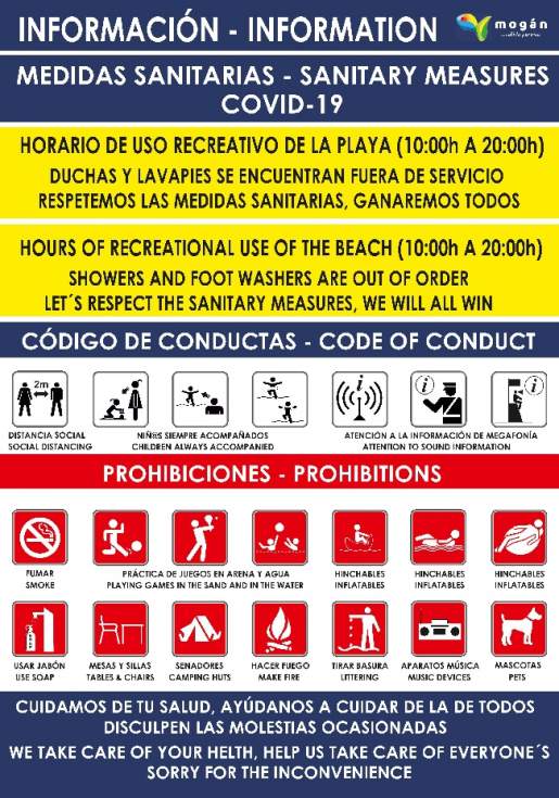 Los que deseen disfrutar de las playas moganeras deberán hacerlo entre las 10:00 y las 20:00 horas. Los accesos serán limitados para controlar el aforo y será obligatorio mantener la distancia de seguridad interpersonal de al menos 2 metros.