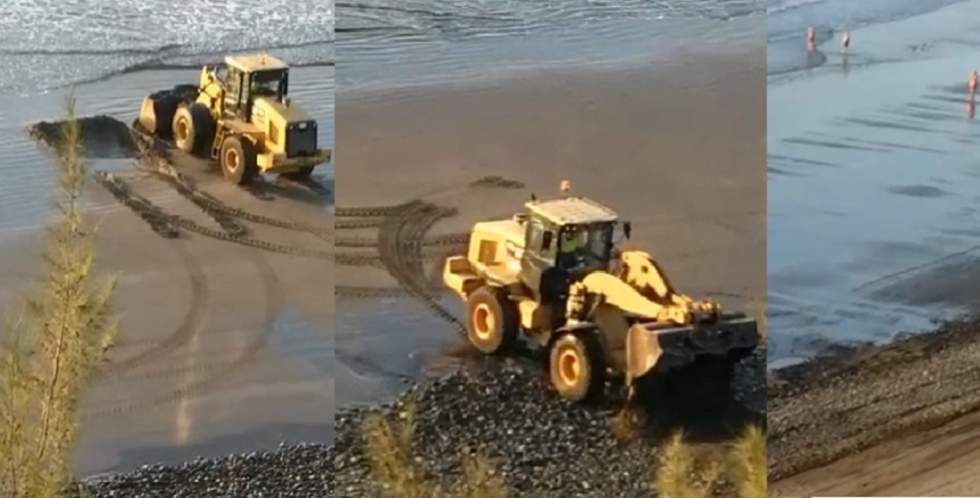 En el dia de hoy, a las 9'30 de la manana, un tractor de la UTE Lopesan-Bitumex.FCC adjudicataria de los servicios municipales, se puso a excavar con la pala arena de la misma orilla y dentro del agua, para llevarla a la zona seca, de piedra y cerca del paseo de Maspalomas-Playa del Inglés.