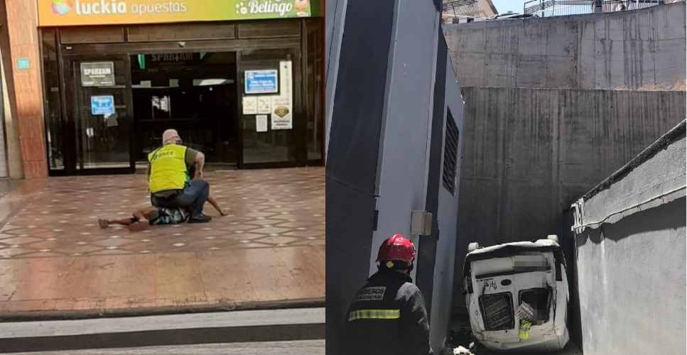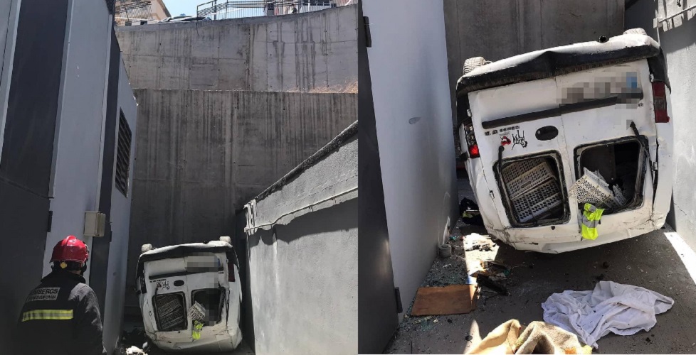 Y en Hoya de la Plata, en la trasera de Mercadona, un vehículo sin ocupantes cayó desde la zona alta con el resultado de las imagenes. No hubo victimas ni lesionados, salvo el susto y los daños materiales.
