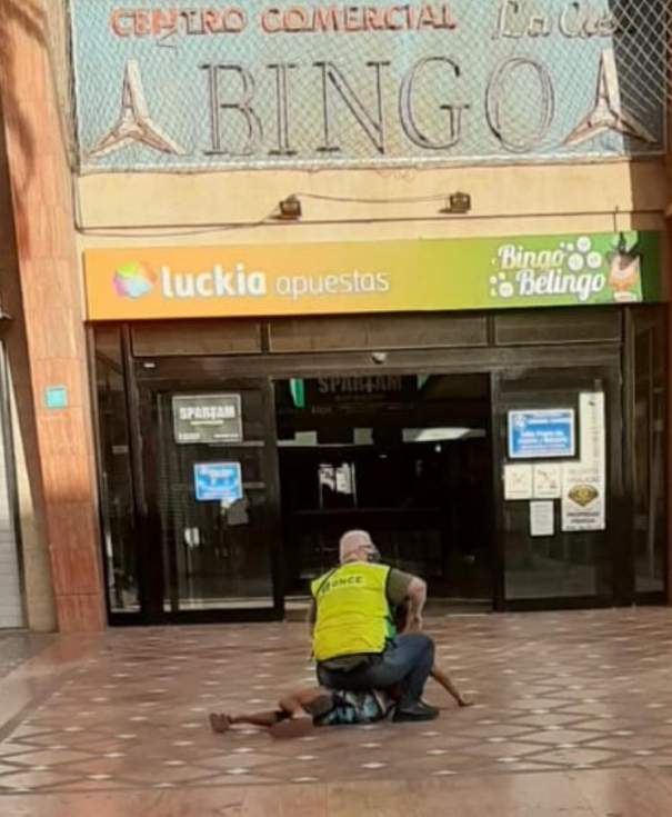 Un vendedor de la ONCE en Vecindario, junto a entrada del Centro Comercial La Ciel resistió el intento de atraco de un sujeto de origen magrebí, que seguramente pensando que era una victima propiciatoria al ser ciego, intentó atracarle con el resultado de la foto, el vendedor le redujo en dos tiempos y terminó con la sentadilla, esperando que llegara las fuerzas del orden.
