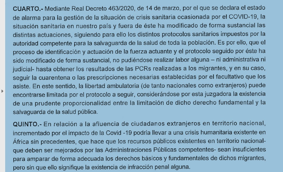 Aqui le reproducimos el auto íntegro del Juzgado de Instrucción Nº2 de Las Palmas, firmado por la Jueza Yanira del Carmen Gonzalez Sosa, la cual en el Fundamento Juridico sexto reitera que no hay delito con la presencia de mil inmigrantes, y lo justifica en que después de la inspección ocular, S.Sª estima que no ha quedado probado que los inmigrantes estén en dicho recinto en contra de su voluntad, ni que se les haya impedido abandonarlo.