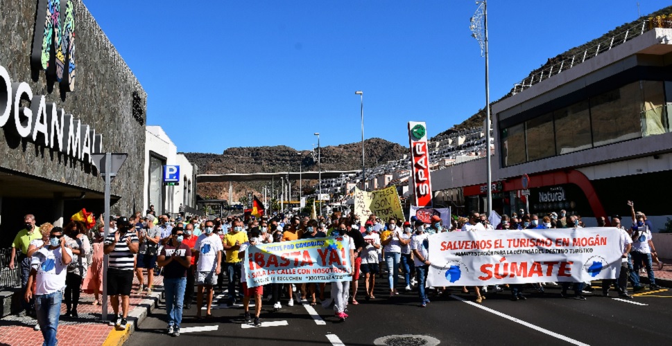 En el núcleo de Puerto Rico, ha tenido lugar una nueva manifestación convocada por la Plataforma 'Salvemos el turismo en Mogán' que clama por la recuperación del uso turístico de complejos de apartamentos y hoteles dado que 11 de estas instalaciones del municipio se están empleando como centros de acogida para las personas migrantes que han llegado a las costas de Gran Canaria. La alcaldesa de Mogán, Onalia Bueno, el grupo de Gobierno, empresarios y trabajadores del sector turístico se han sumado a la marcha.