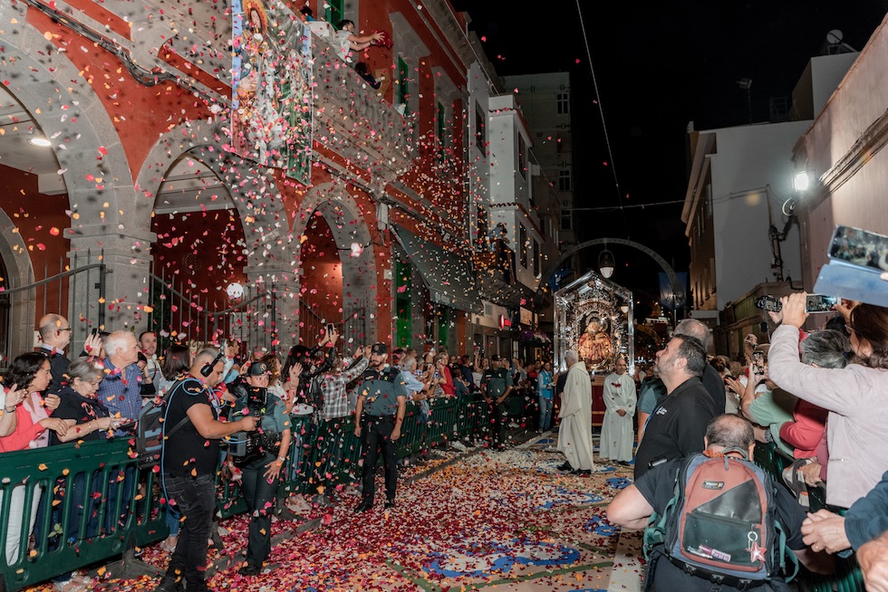 Acompañada por la Corporación Municipal que preside Teodoro Sosa y junto al Vicario de la Diócesis de Canarias, Hipólito Cabrera, el cura párroco de la Iglesia de Santiago, Manuel Reyes, y la representación de la Villa de Teror con su alcalde Gonzalo Rosario, la Patrona de Gran Canaria llegó pasadas las 6.30 de la mañana y su entrada a la calle Capitán Quesada decorada con vistosas alfombras y la luna llena al fondo, fue sin duda la imagen de este día inolvidable.