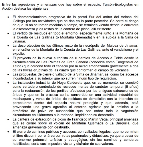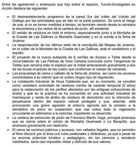 Turcón además denunciaba desde el inicio, la ocupación ilegal de servidumbres y accesos a la zona, asi como las agresiones con las nubes de polvo que se depositan en kilometros a la redonda afectando a la flora, a los animales y a las viviendas circundantes.